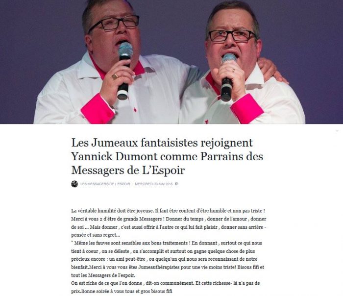 Suite à différents passages TV, Thierry BIDAUD président des « messagers de l’espoir » les a contactés pour devenir parrains de l’association. Ils ont toute de suite répondu présents, partageant ainsi la philosophie de tous ces merveilleux bénévoles qui oeuvrent pour venir en secours des parents victimes de l’injustice qu’ils peuvent vivre auprès de leur enfants lourdement handicapés. Ils se sont engagés pour des temps forts et spectacles où les sommes ont été versées pour l’association. Ils ont même créé une chanson fait un clip en faisant la surprise lors de la diffusion d’un grand spectacle au théâtre de Pavilly.