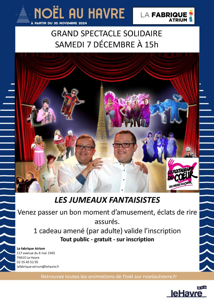 Les jumeaux fantaisistes ont répondu présents et co organisé l’opération « UN JOUET/UN NOËL » avec la ville du HAVRE à L’ATRIUM qui allie divertissement et solidarité. Les fonds récoltés grâce à cette soirée ont été directement à l’association des Restos du Coeur pour aider les personnes dans le besoin. Une journée ludique où rires et apprentissages se conjuguent pour offrir un moment de bonheur aux enfants.