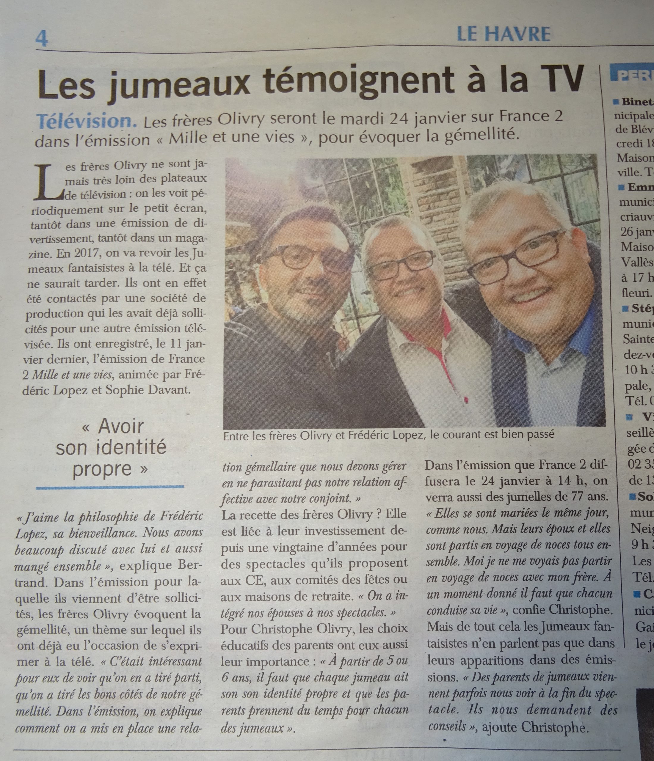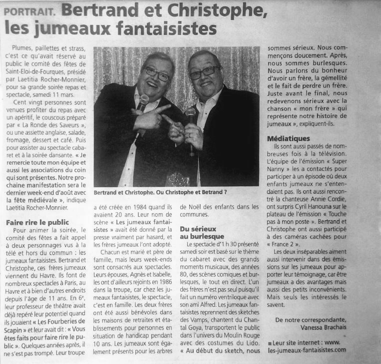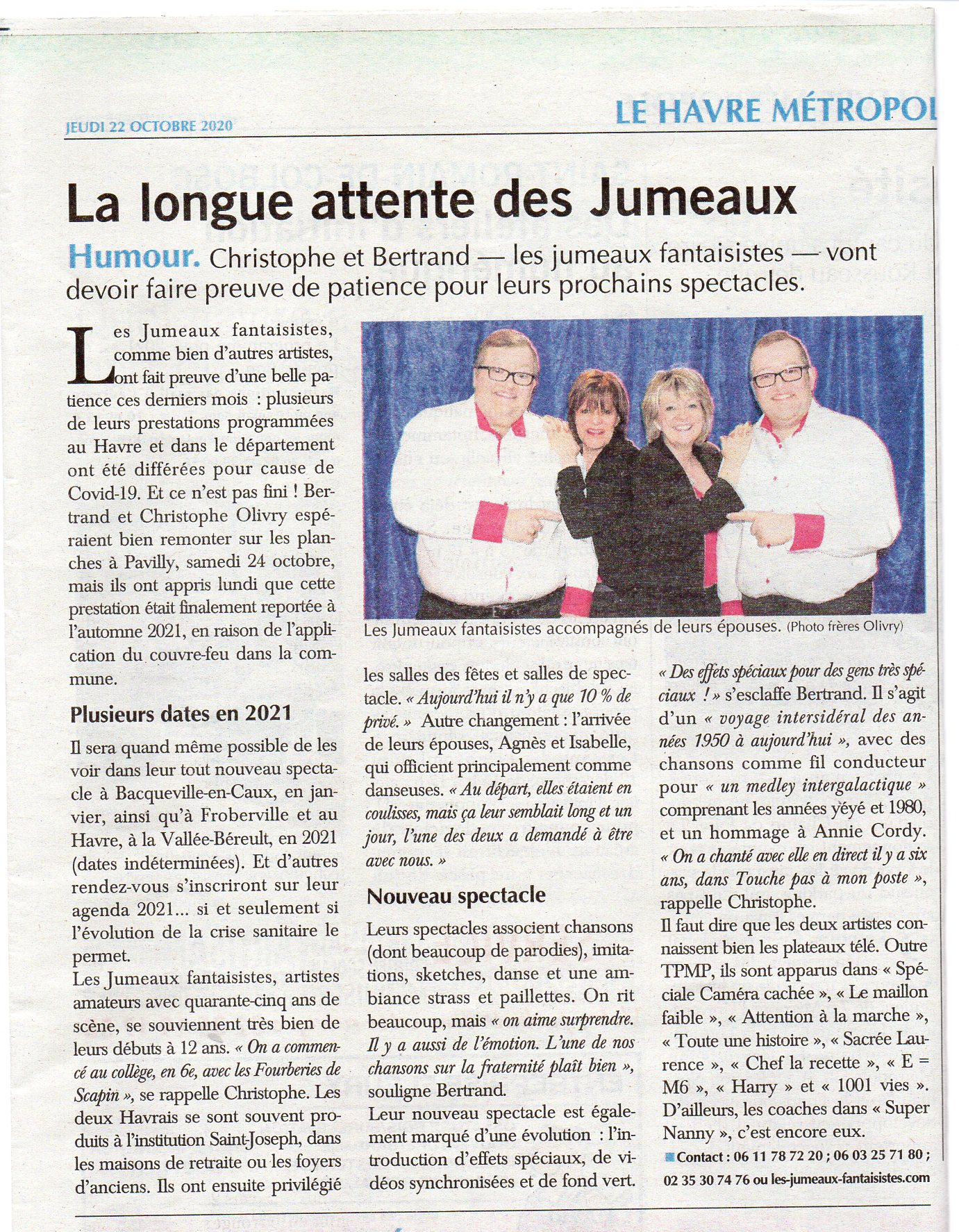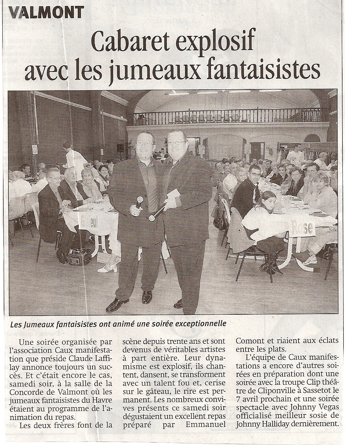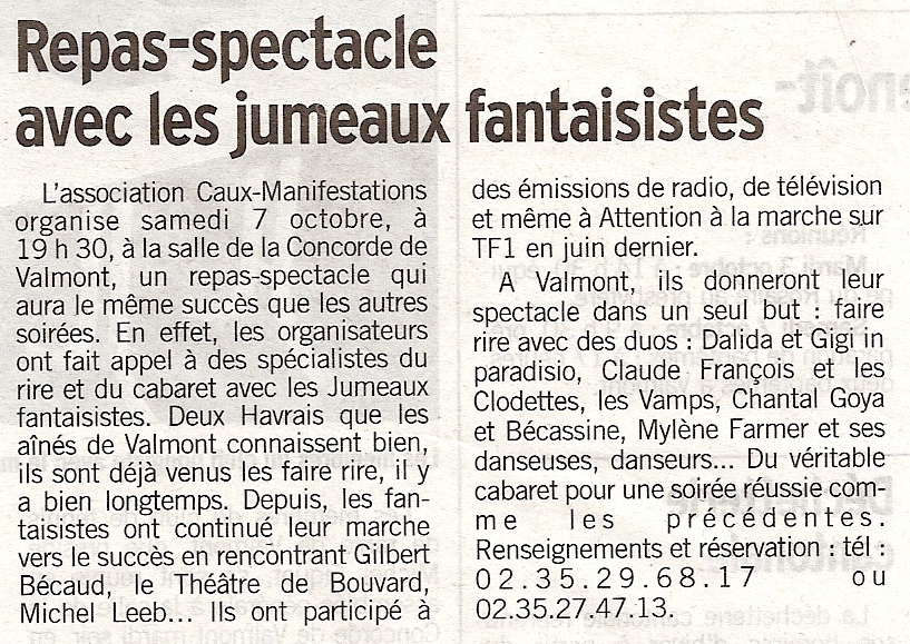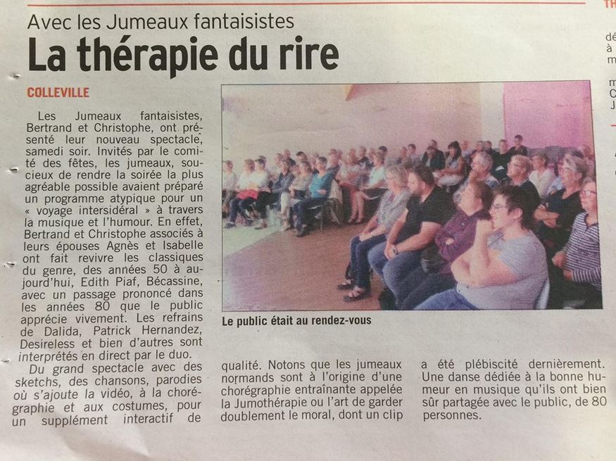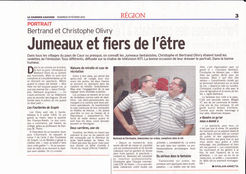 Les Jumeaux fantaisistes tiennent à remercier tous les journalistes de La voix du Nord, Ouest France, Paris Normandie, Le Havre Presse et le Havre libre, Le Courrier Cauchois, l’Eveil, Télé 7 jours, Télé z… pour leurs éloges d’hier et d’aujourd’hui qui ont leur ont permis de se faire connaitre et reconnaitre dans leur singulatité et originalité.