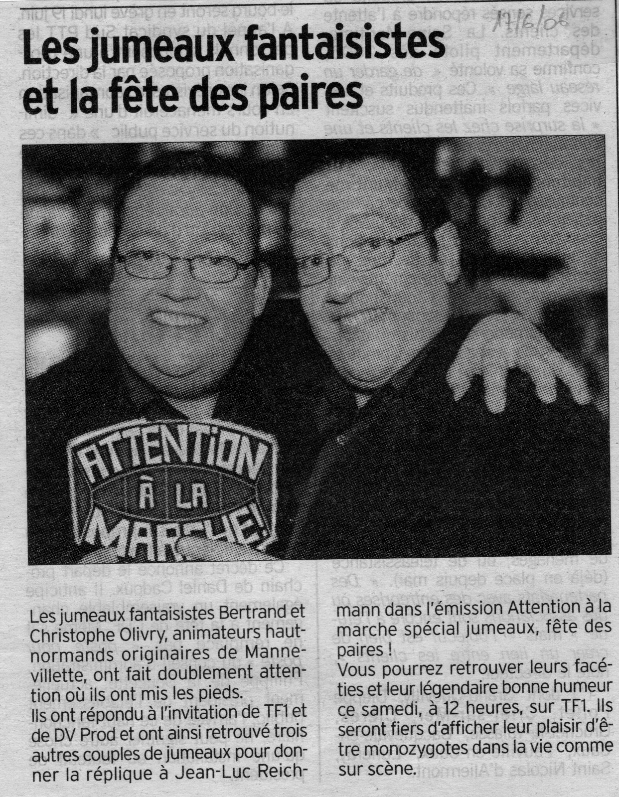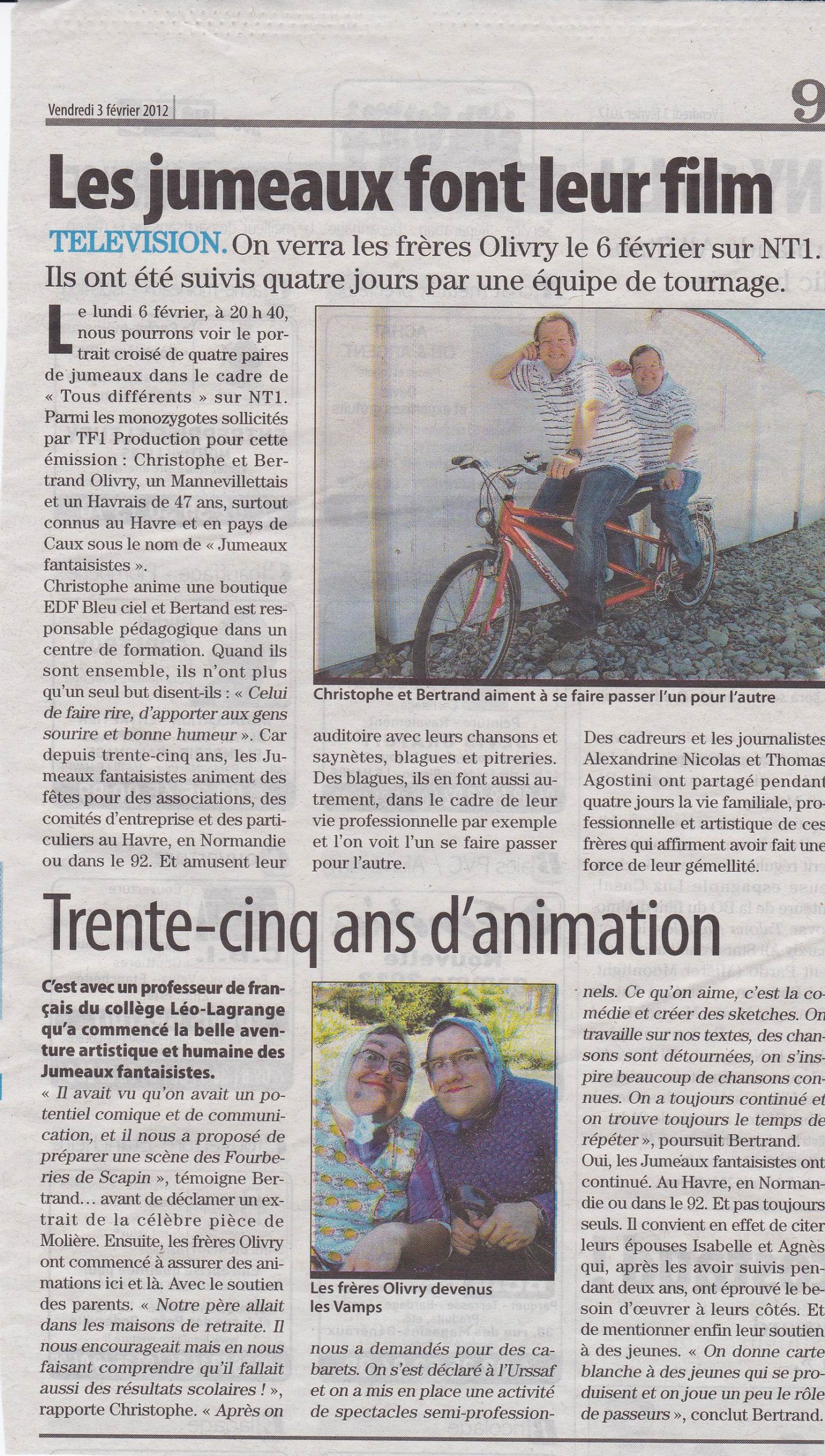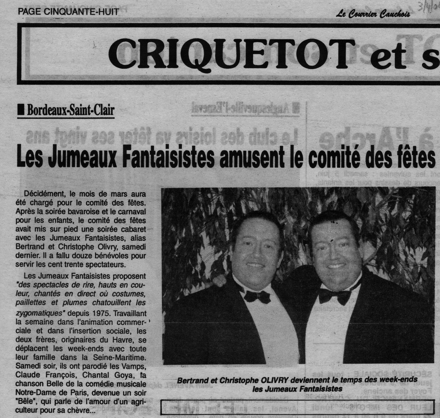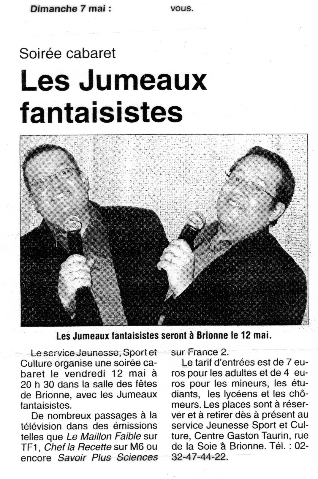 Les Jumeaux fantaisistes tiennent à remercier tous les journalistes de La voix du Nord, Ouest France, Paris Normandie, Le Havre Presse et le Havre libre, Le Courrier Cauchois, l’Eveil, Télé 7 jours, Télé z… pour leurs éloges d’hier et d’aujourd’hui qui ont leur ont permis de se faire connaitre et reconnaitre dans leur singulatité et originalité.