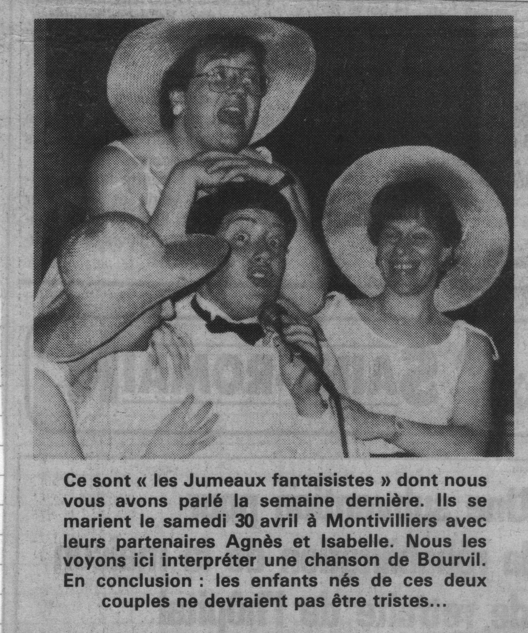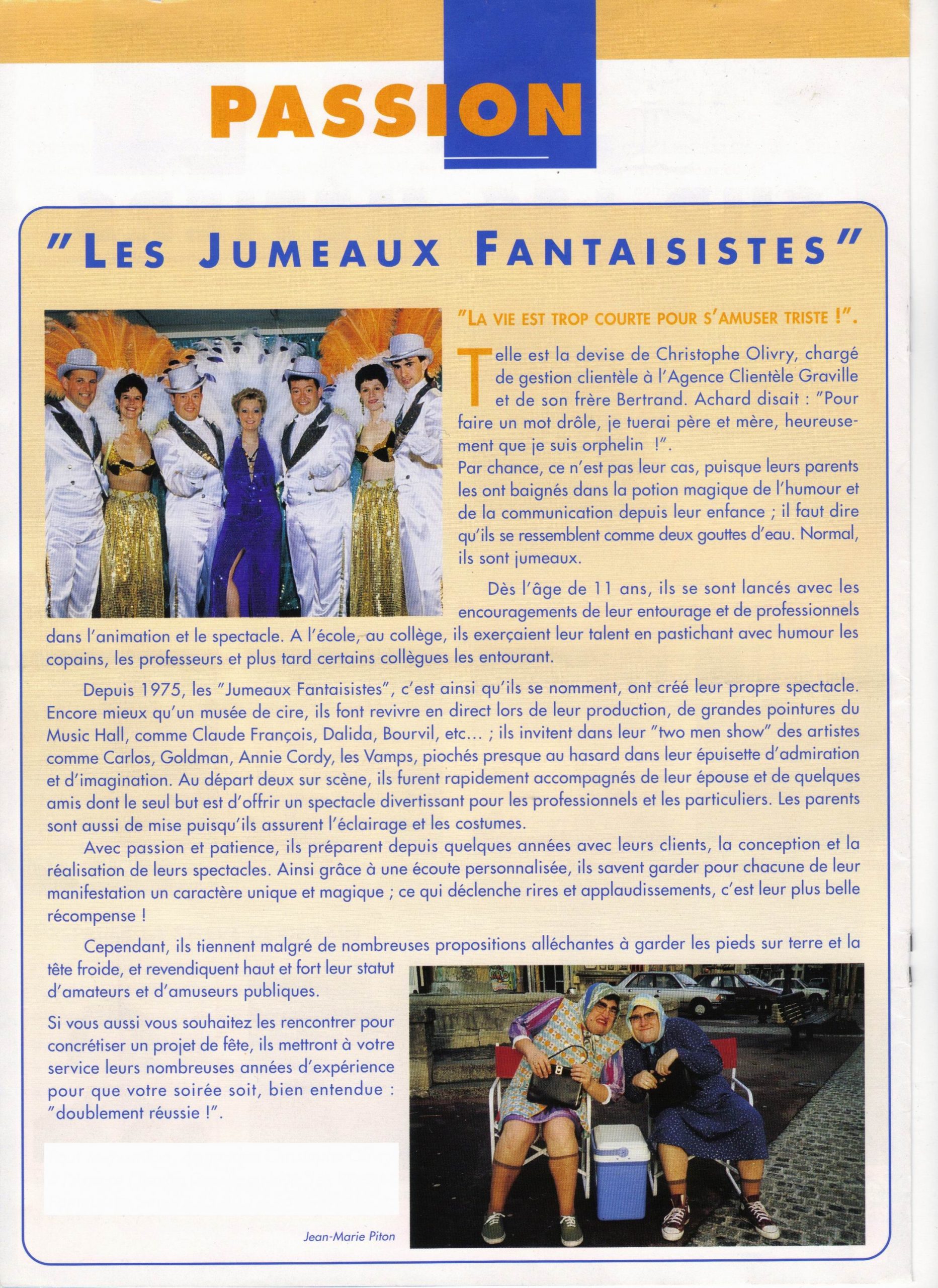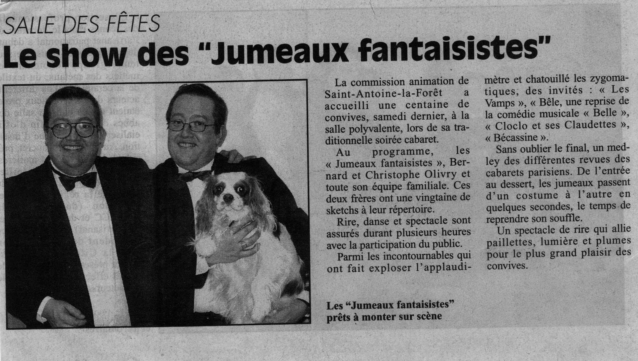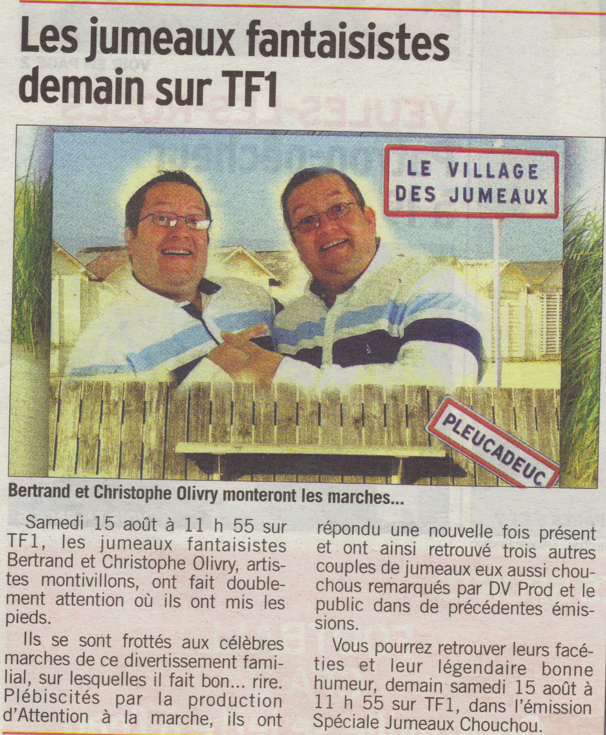 Les Jumeaux fantaisistes tiennent à remercier tous les journalistes de La voix du Nord, Ouest France, Paris Normandie, Le Havre Presse et le Havre libre, Le Courrier Cauchois, l’Eveil, Télé 7 jours, Télé z… pour leurs éloges d’hier et d’aujourd’hui qui ont leur ont permis de se faire connaitre et reconnaitre dans leur singulatité et originalité.